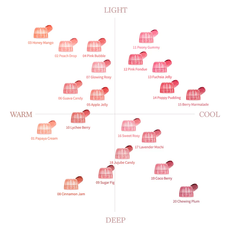 04 Pink Bubble ,07 Glowing Rosy ,10 Lychee Berry ,11 Peony Gummy ,13 Fuchsia Jelly ,16 Sweet Rosy ,19 Coco Berry |