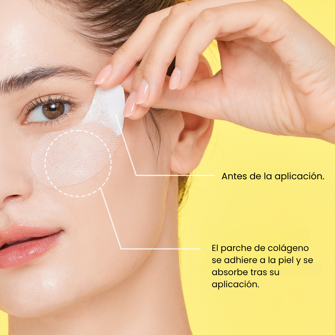 Parche anti-edad intesivo con colágeno que se aplica sobre la piel y se disuelve al contacto con la humedad, liberando ingredientes activos directamente en la zona para hidratar intensamente, suavizar arrugas y mejorar la elasticidad.