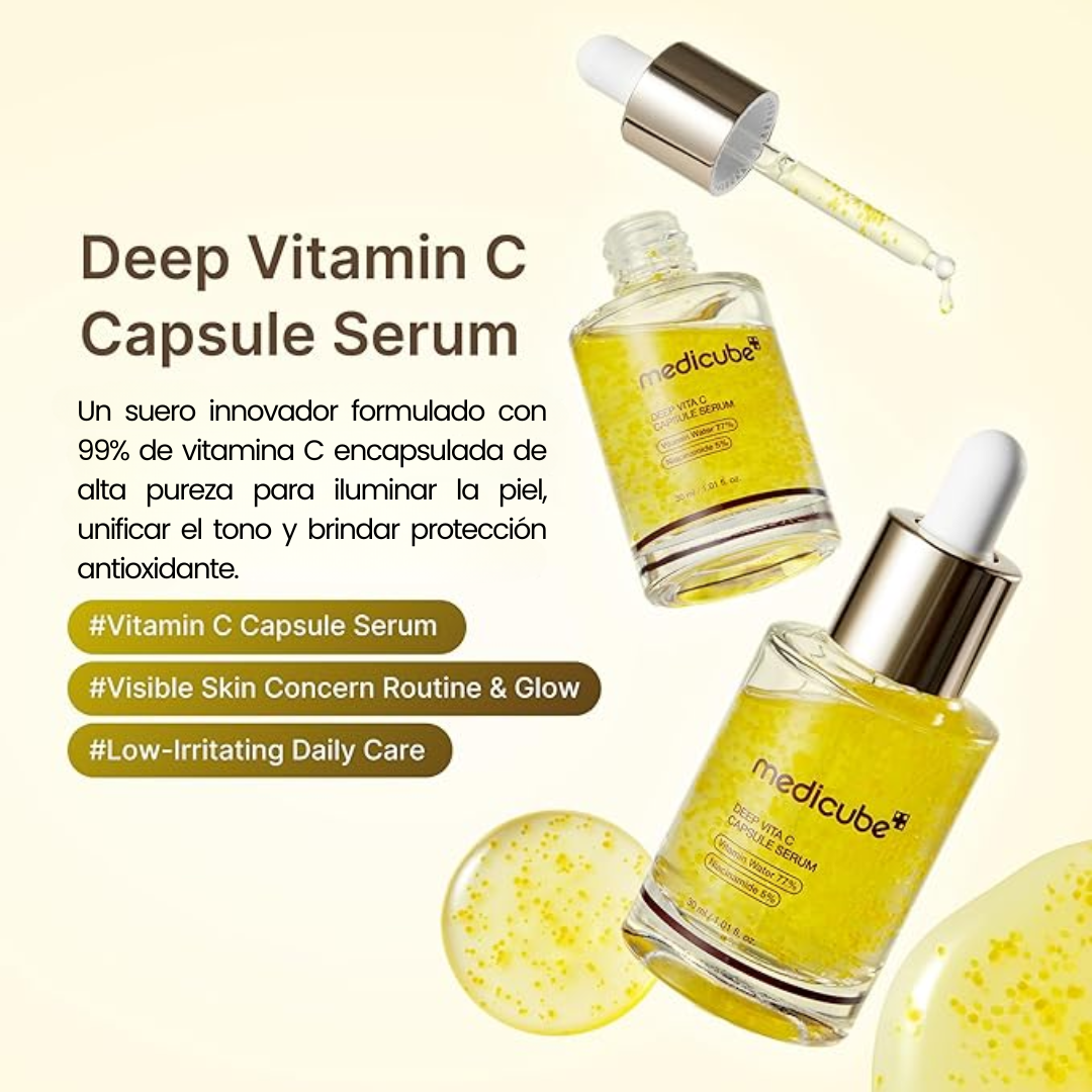 El Medicube Deep Vita C Capsule Serum 30ml es una solución potente para el cuidado de la piel que utiliza una fórmula innovadora en cápsulas para mejorar la luminosidad y unificar el tono de la piel. Está diseñado para combatir las manchas oscuras y revitalizar la piel apagada.