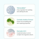 - TECALMING™: Una fórmula patentada que ayuda a regular la producción de sebo, destapar los poros y calmar la piel inflamada.
