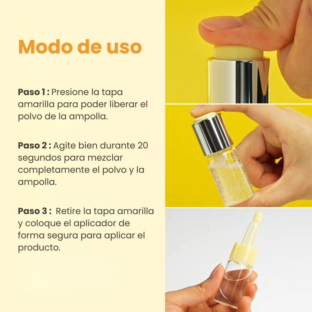 - Sérum concentrado despigmentante con glutatión y ácido tranexámico que ayuda a reducir manchas oscuras y unificar el tono de la piel.