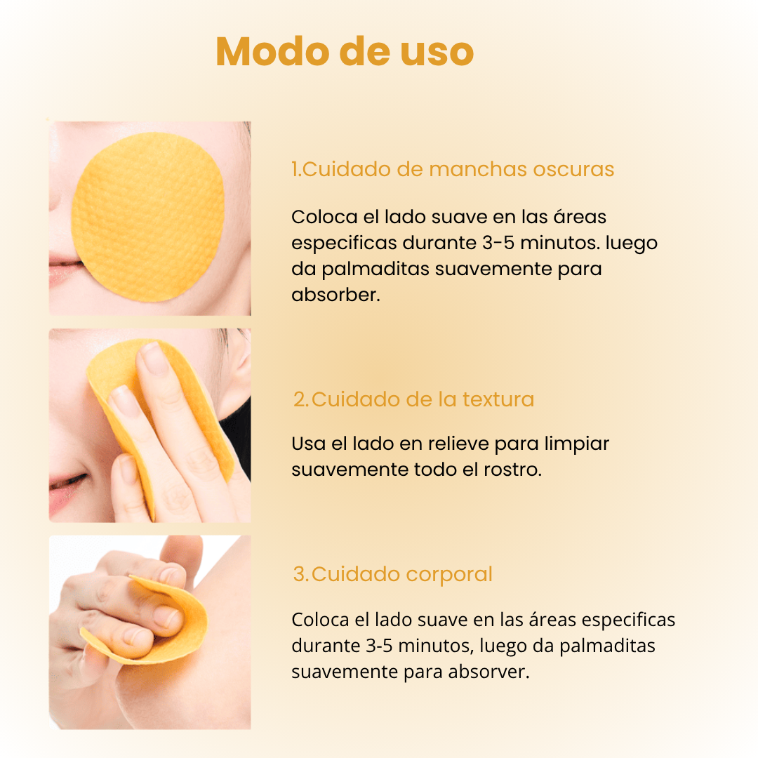 - Almoadillas exfoliantes con ácido kójico y ácido tranexámico que ayudan a mejorar el tono de piel desigual y reducir la apariencia de manchas oscuras.